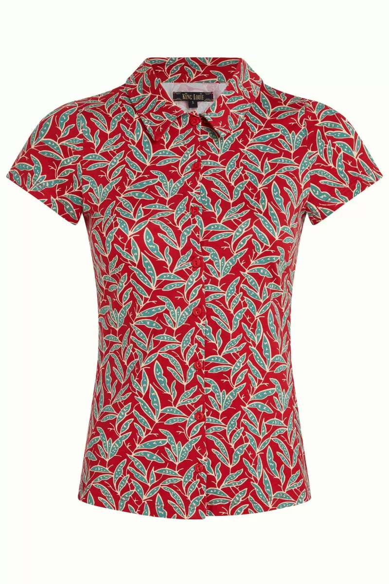 Blouse Met KraagDoorknoopsluitingKorte MouwenJerseyStretchstofBladeren Print