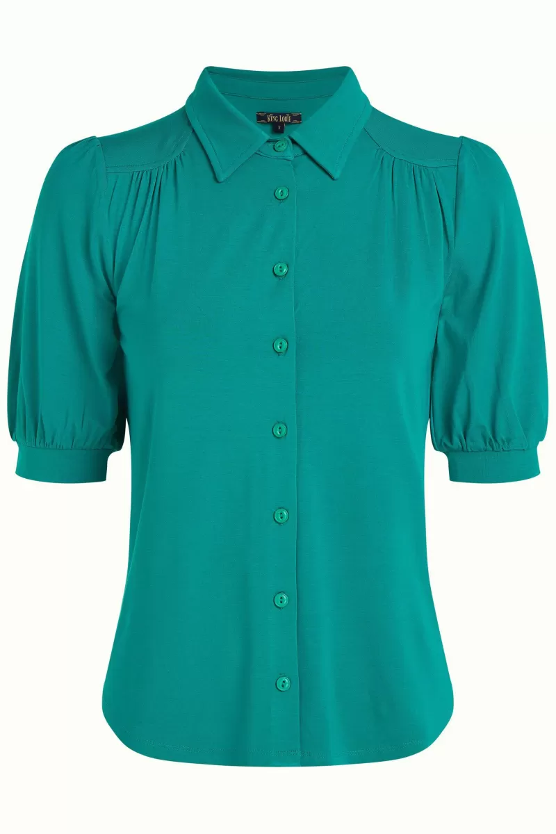 Blouse Met KraagKorte Mouwen Met ManchettenKnoopsluitingPlooien Vanuit De SchouderpasPlooien Bij De MouwenJerseyStretchs…