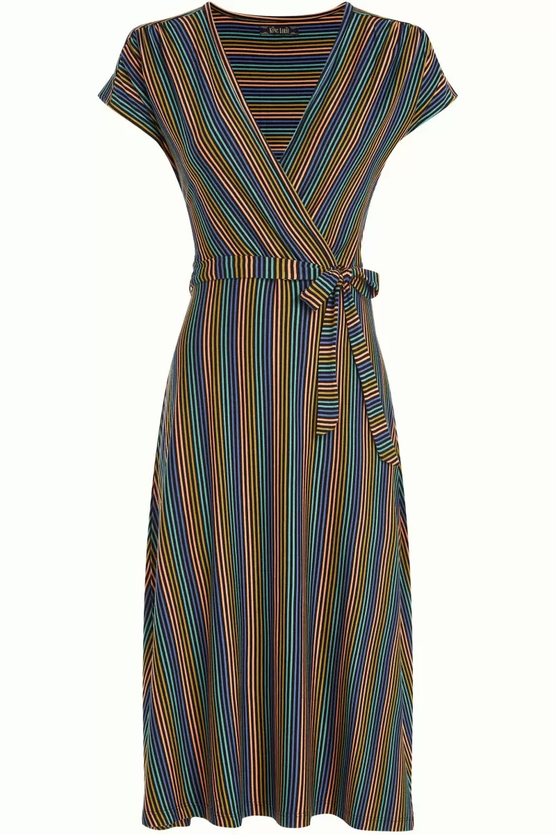 Gestreepte OverslagjurkV-HalsKorte MouwenWijd Uitlopende RokVaste TaillebandJerseyStretchstof