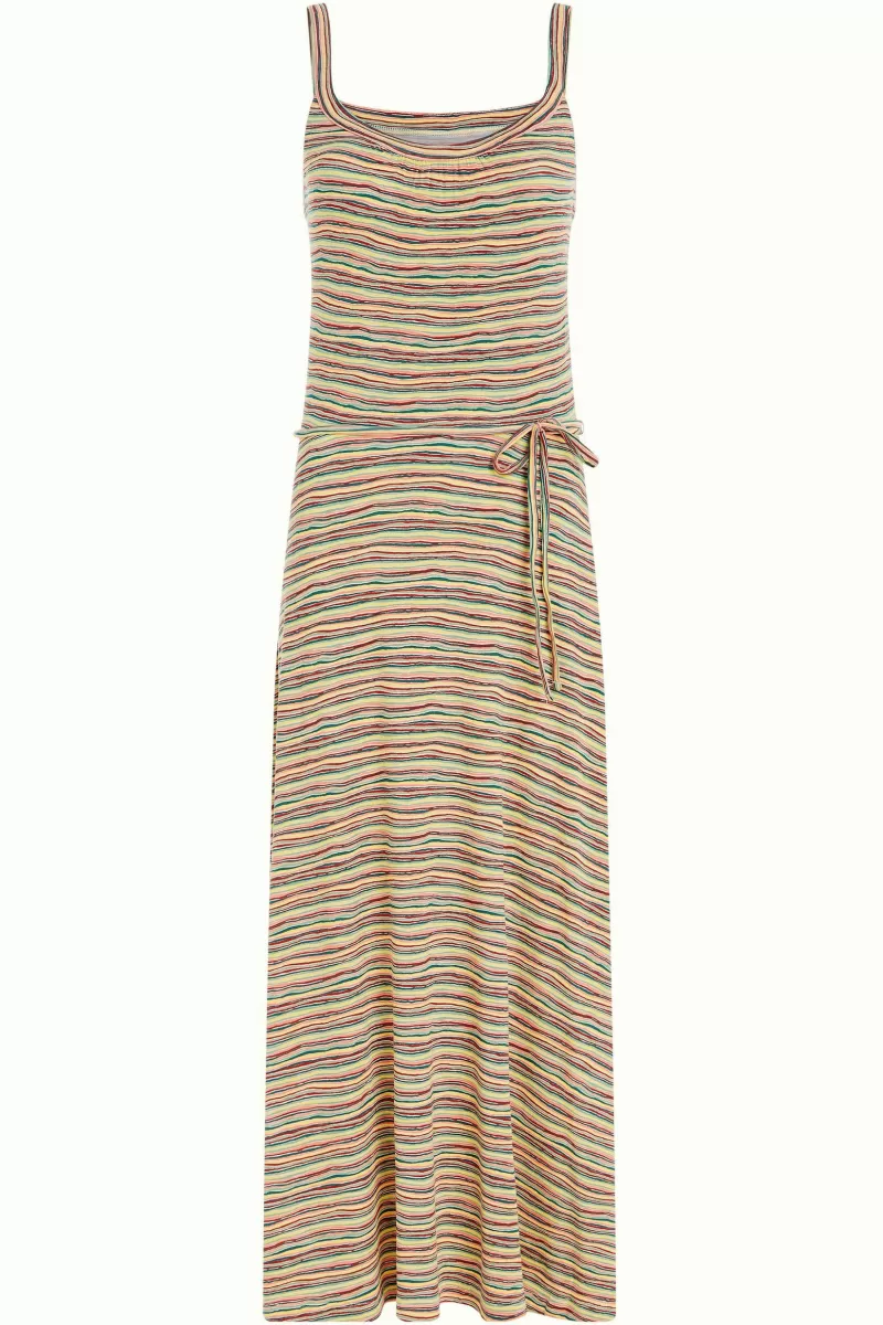 Midi JurkSpaghettibandjesStrikceintuur In Dezelfde StofUitlopende RokJerseyStretchstofGestreept
