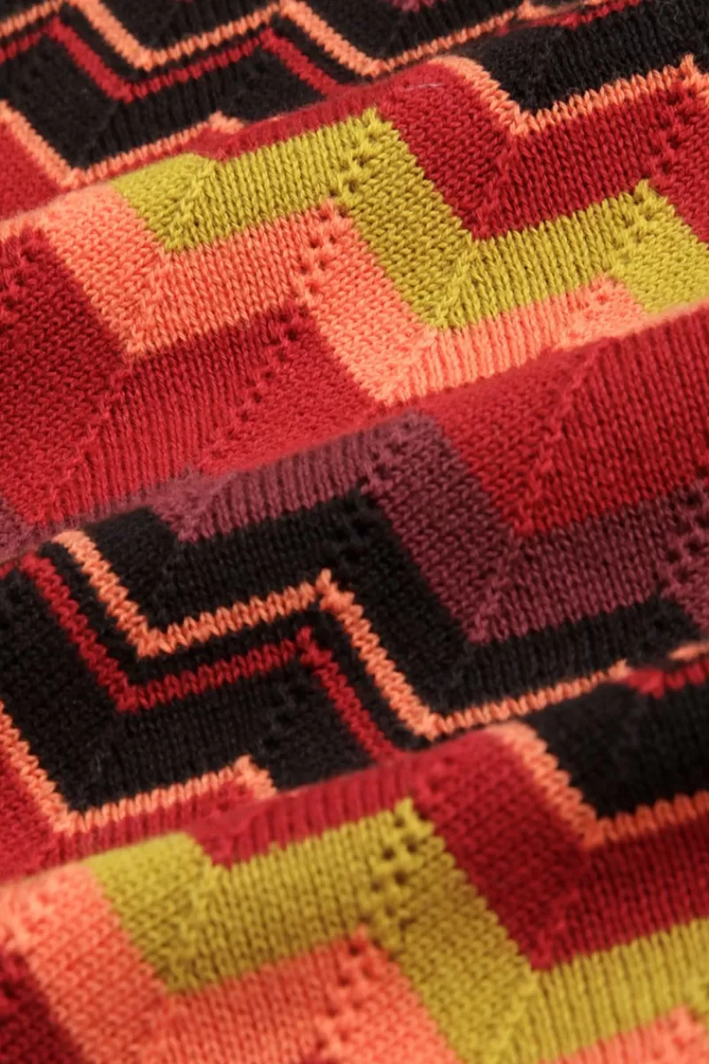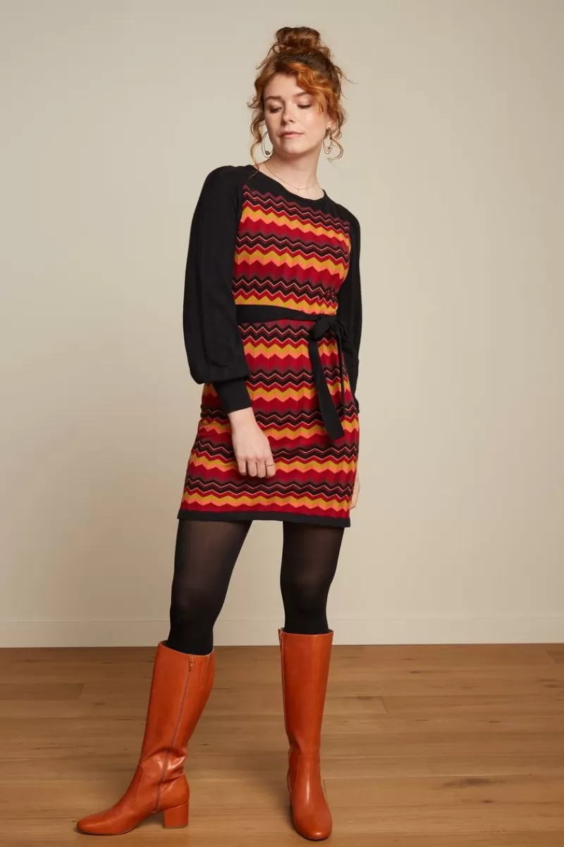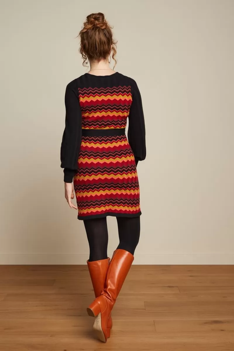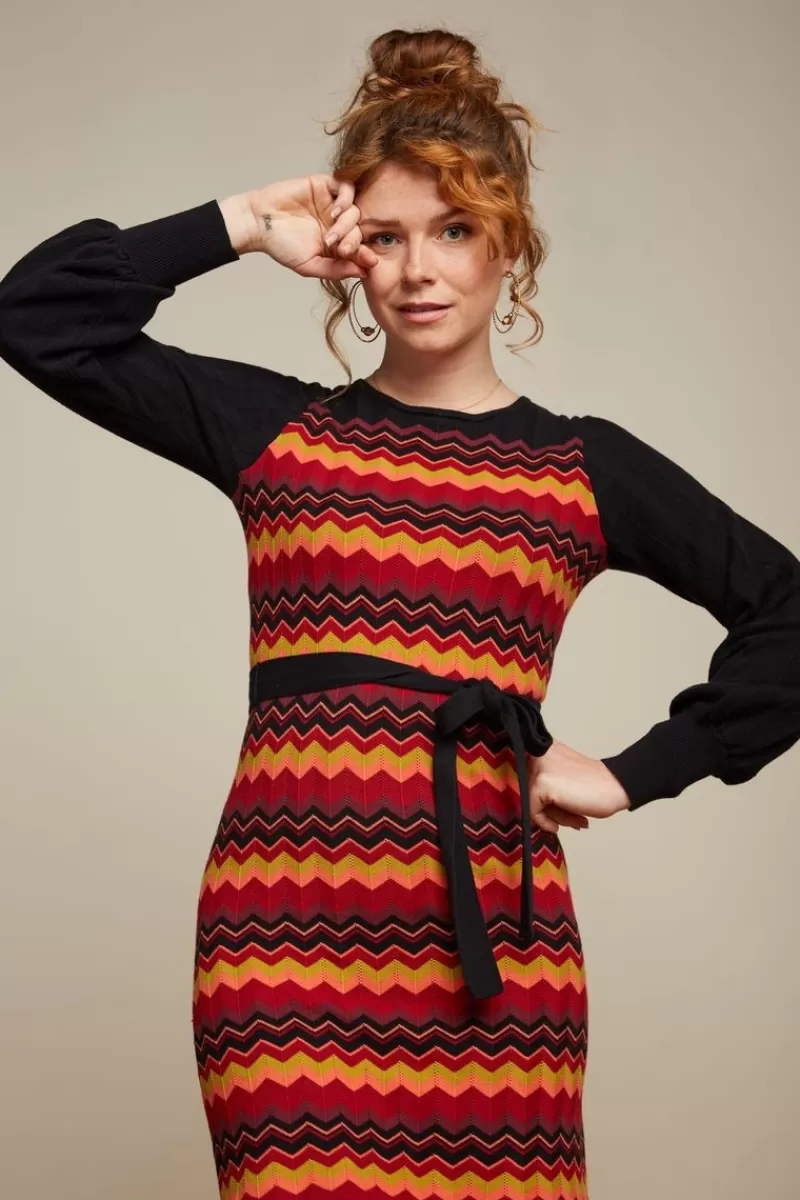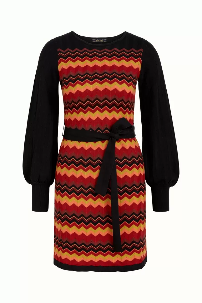 Gebreide TuniekRonde HalsLange, Contrasterende BallonmouwenStrikceintuurStretch StofZigzagpatroon