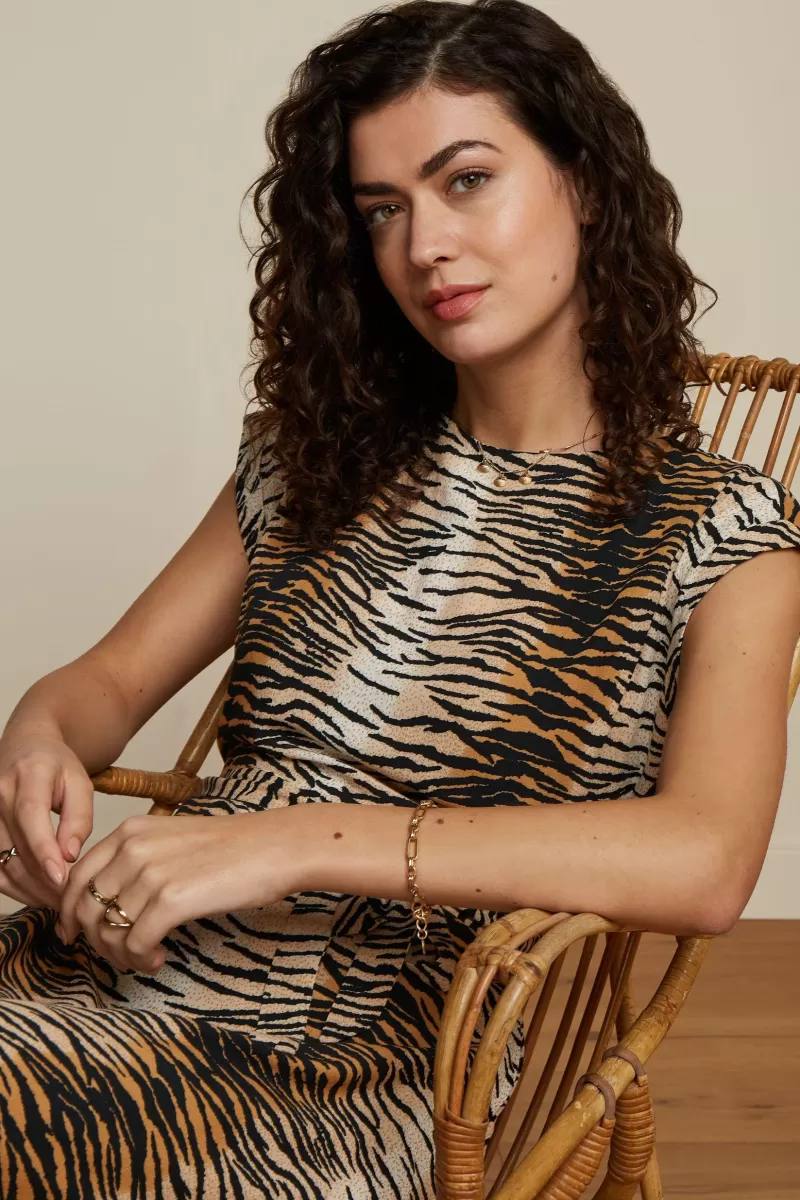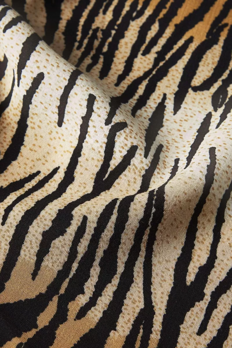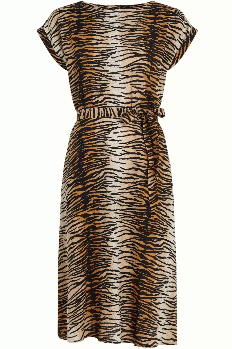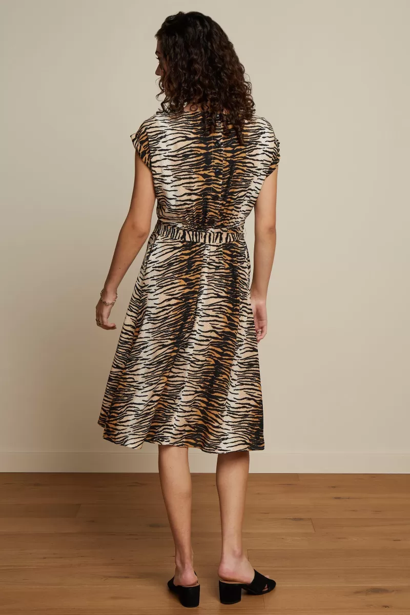 Wijd Uitlopende JurkLosse FitRonde HalsKorte MouwenKnoopsluiting Op De RugGewevenNon StretchTijgerprint