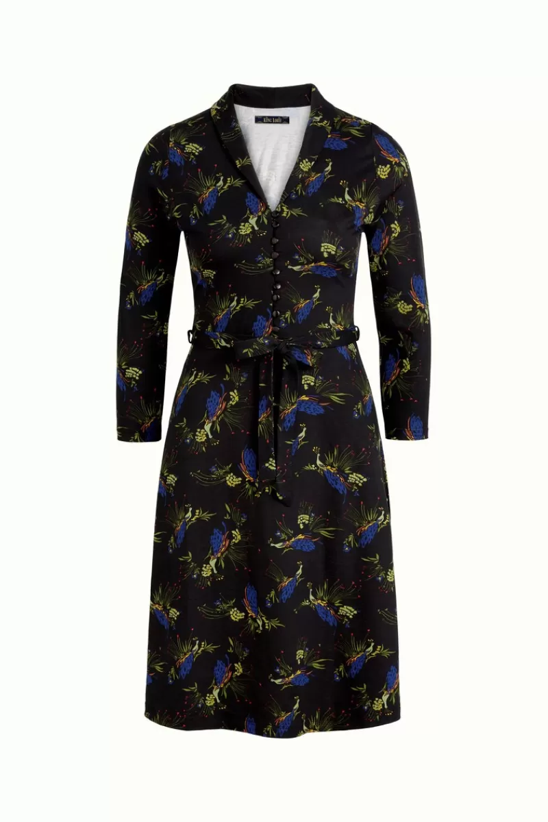 Wijd Uitlopende JurkSjaalkraagDriekwart MouwenKnoopsluitingStrikceintuurJerseyStretch StofPauwen Print