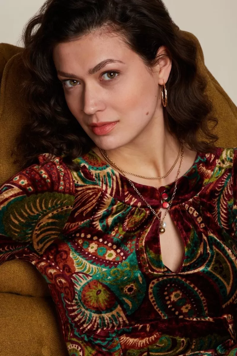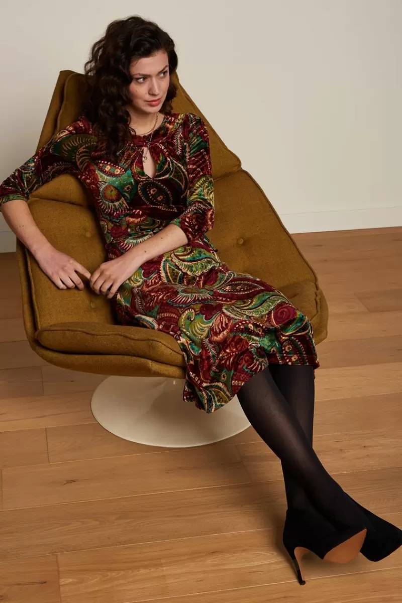 Wijd Uitlopende Midi JurkDriekwart MouwenRonde HalsKeyhole KnoopsluitingJersey JacquardStretchPaisley Print