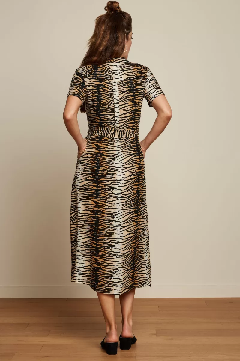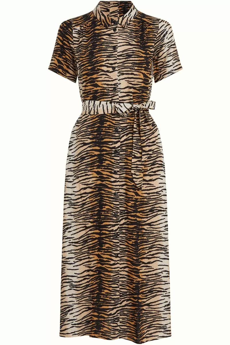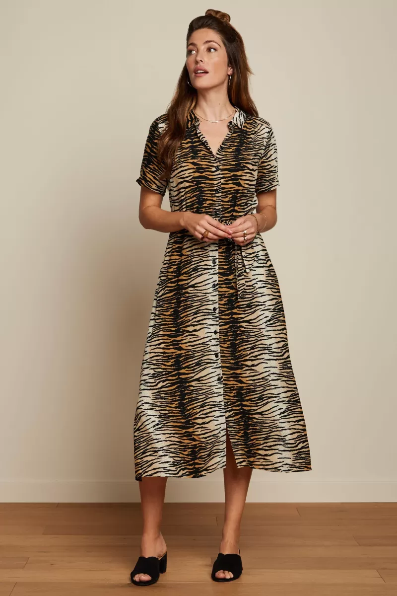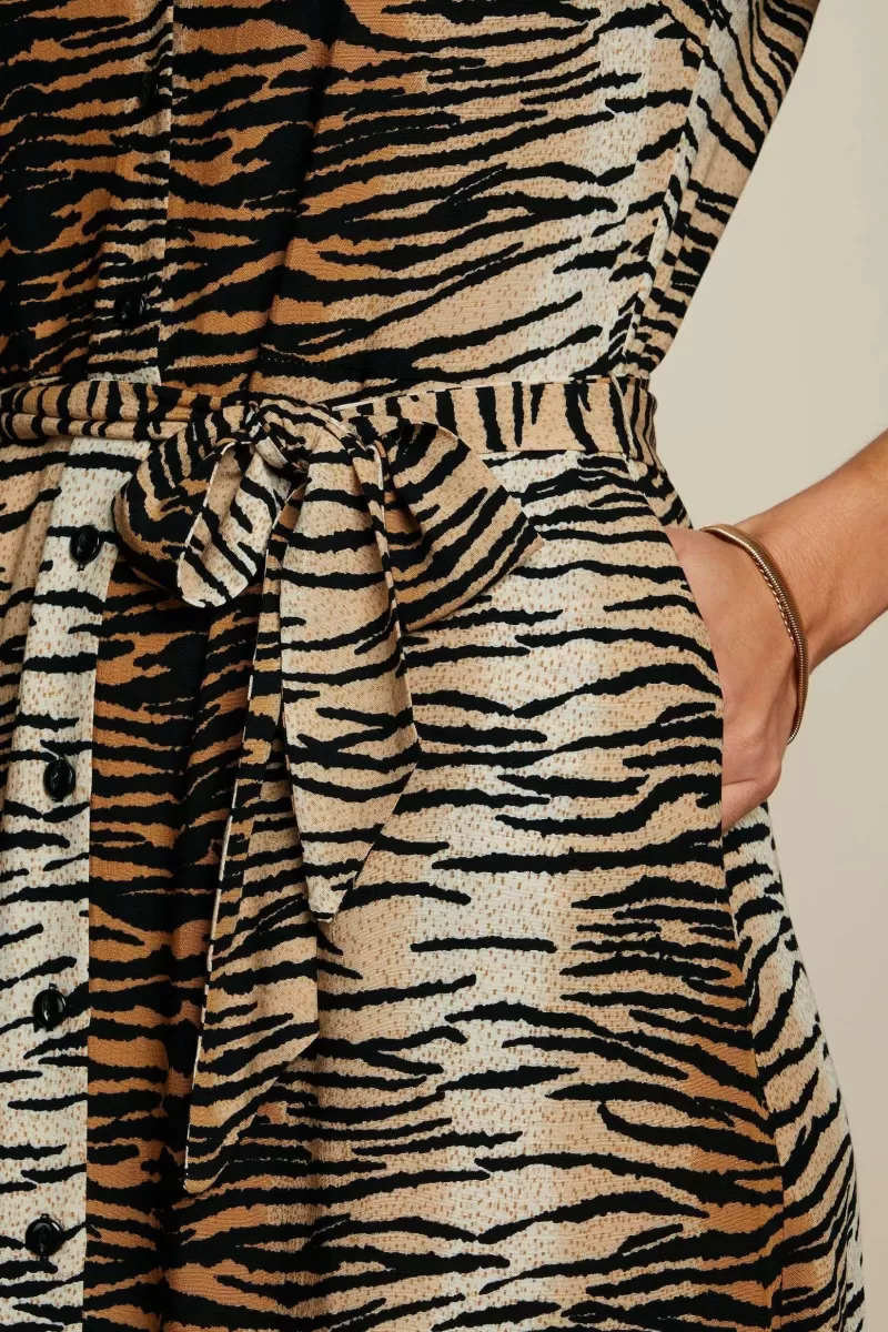 Jurk Met Korte MouwenBlousekraagMidi RokCoupenadenDoorknoopsluitingStrikceintuurSteekzakkenGewevenNon StretchTijgerprint