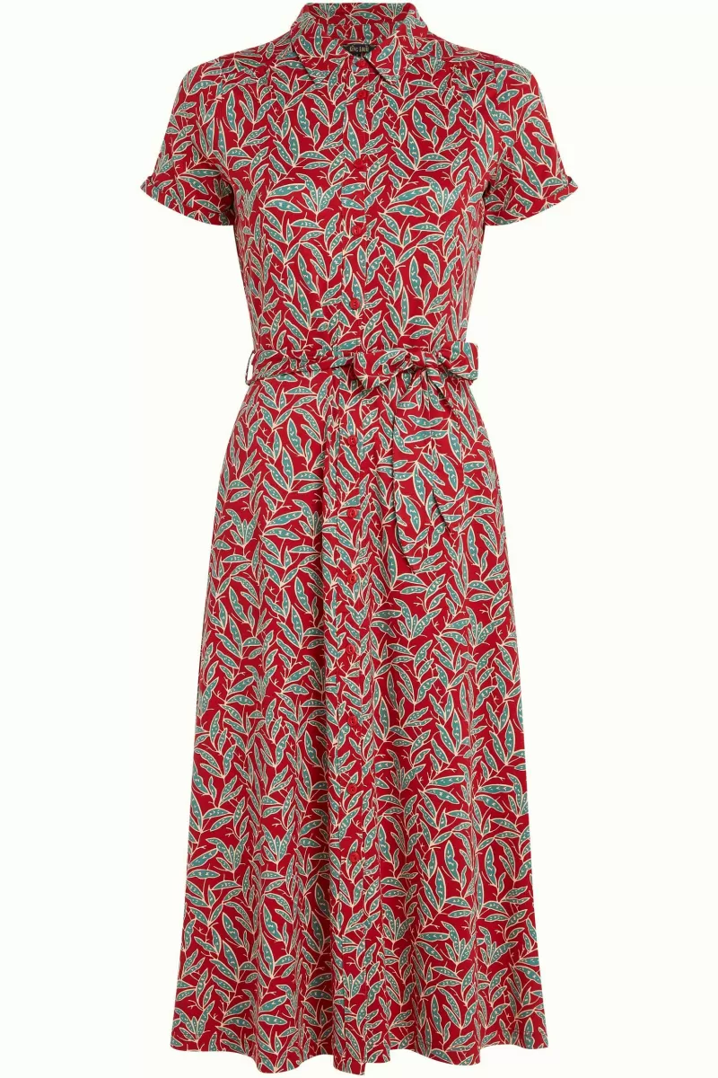 Jurk Met Korte MouwenBlousekraagMidi RokCoupenadenDoorknoopsluitingStrikceintuurSteekzakkenGewevenNon StretchBladeren Pr…