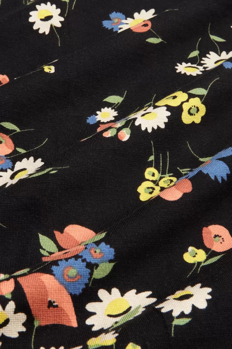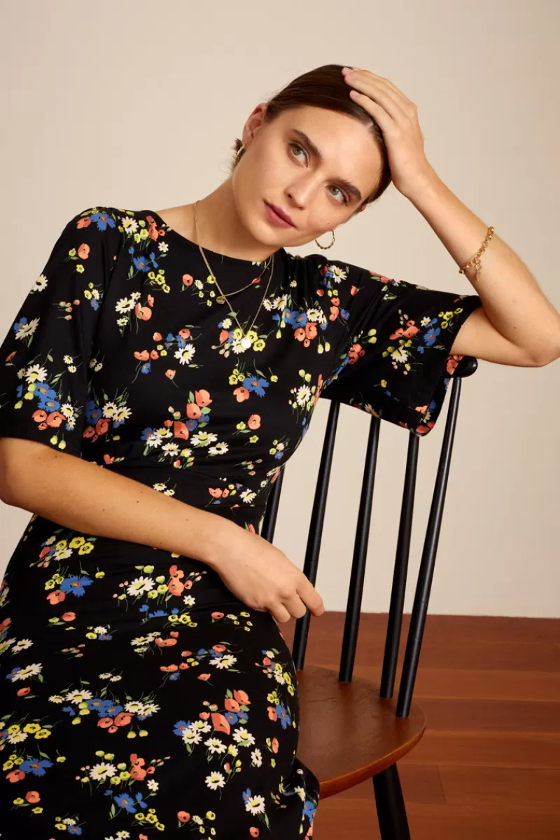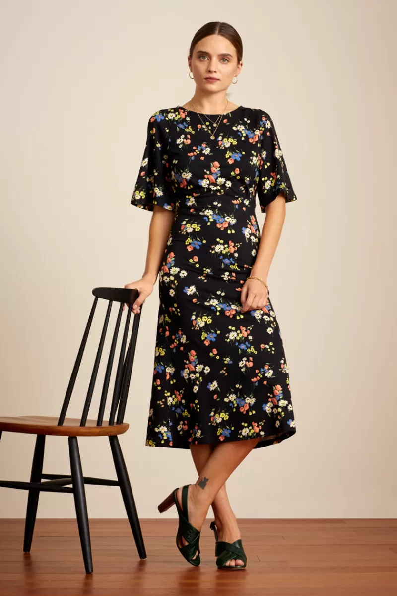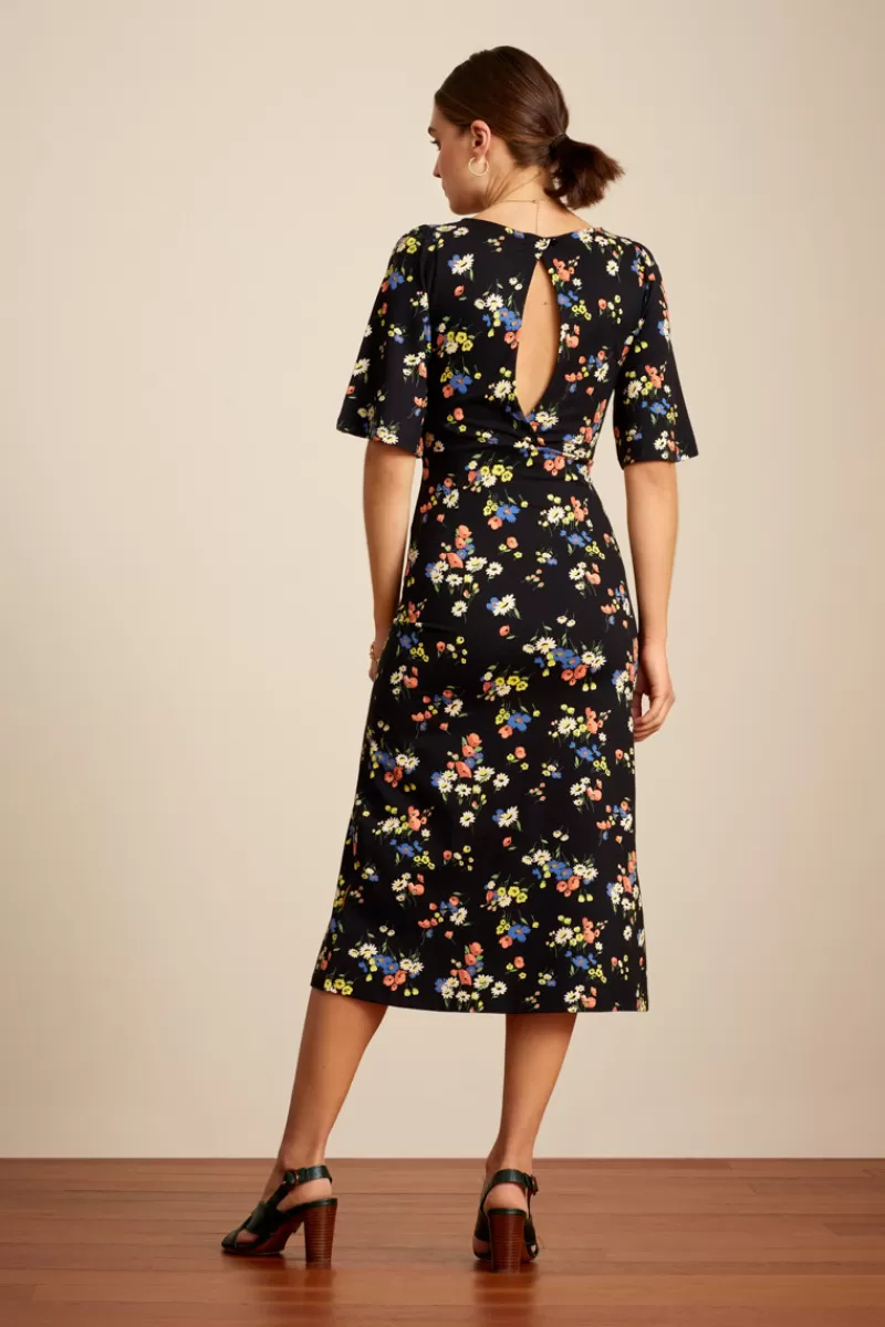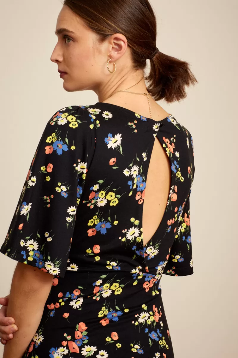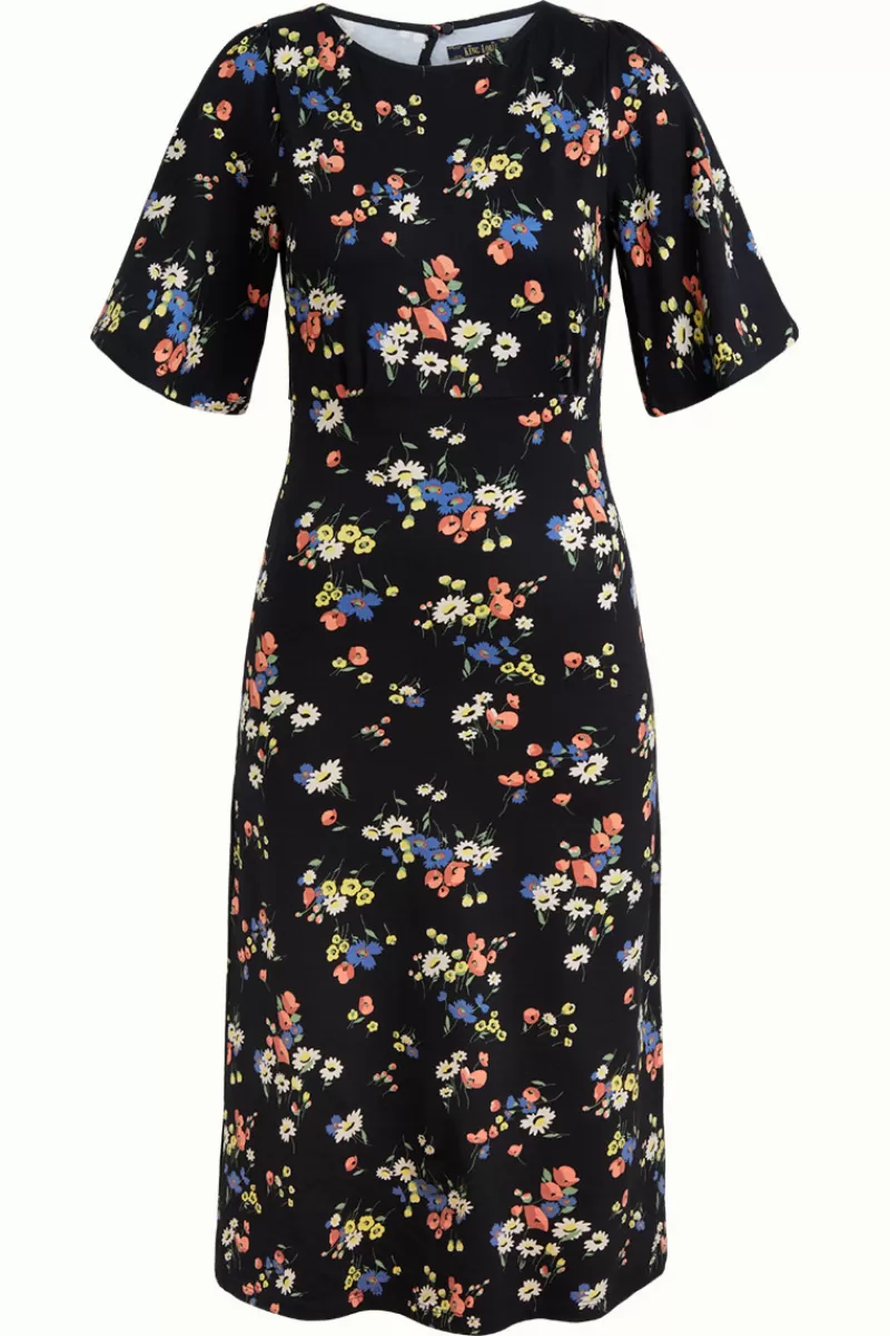 Midi JurkKorte MouwenRonde HalsCoupenaad Met Plooitjes Op De BorstKeyhole Sluiting Met KnoopjeJersey Met StretchBloemenp…