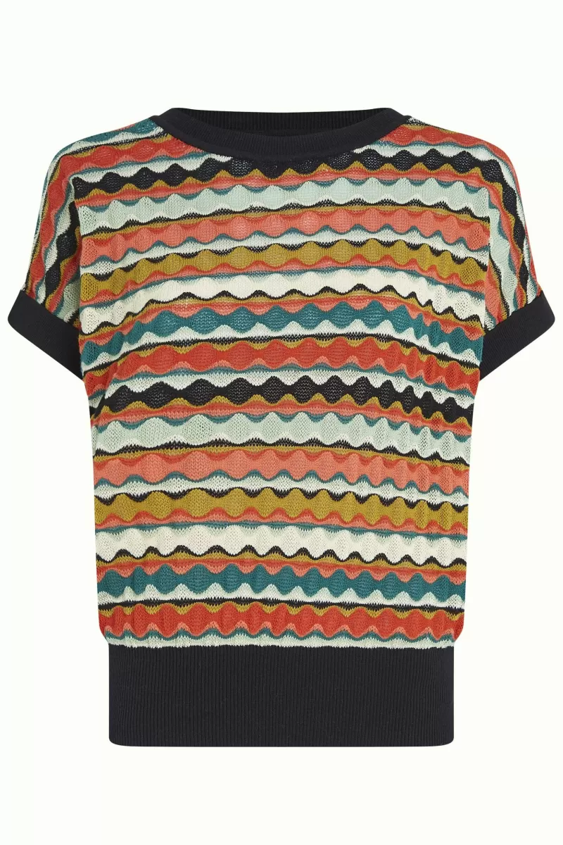Top Met BoothalsKorte MouwenContrasterende RibboordenGebreid StretchGolvend Motief