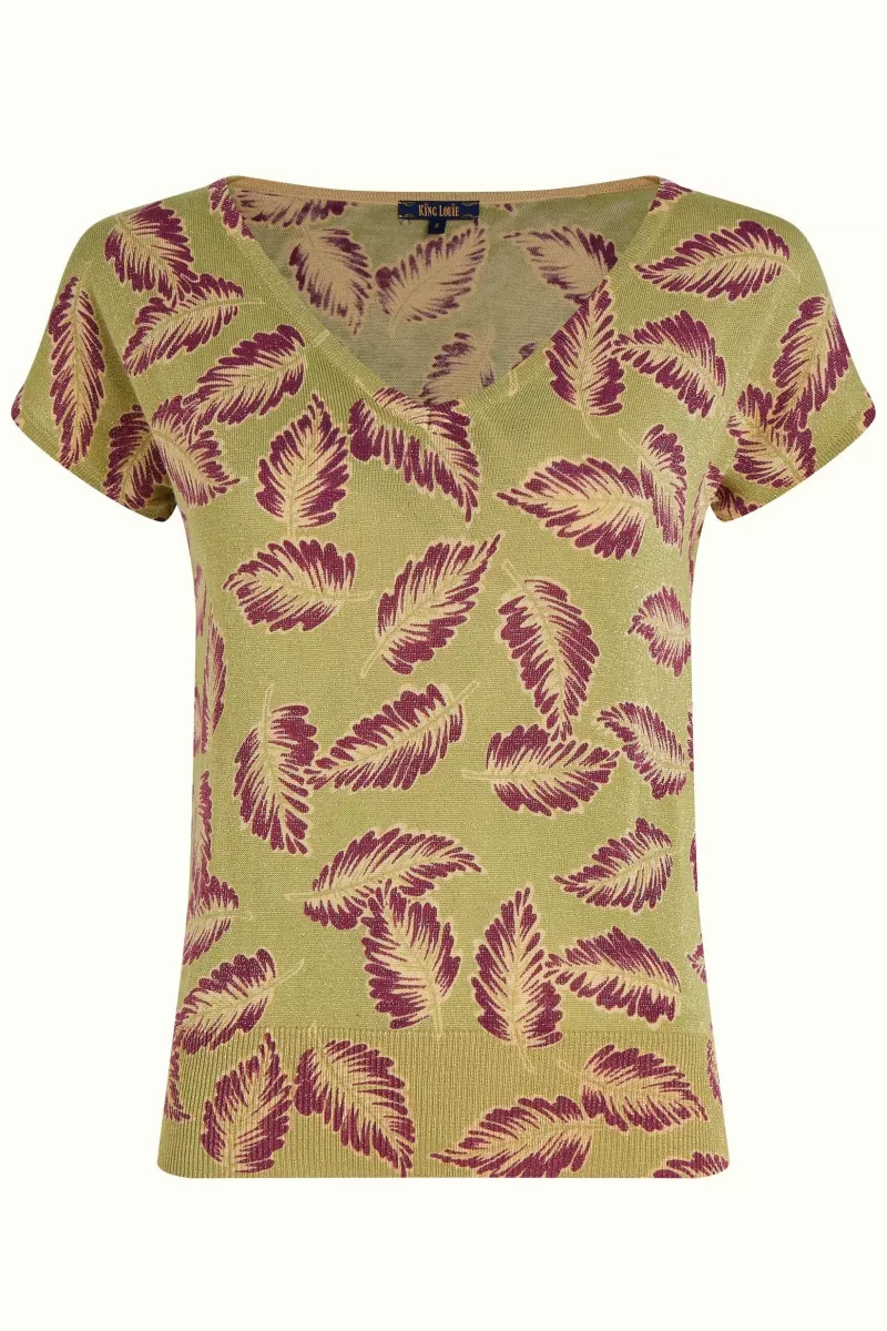 Gebreide TopV-HalsKorte MouwenGeribbelde Halslijn En ZoomStretchBladeren Print